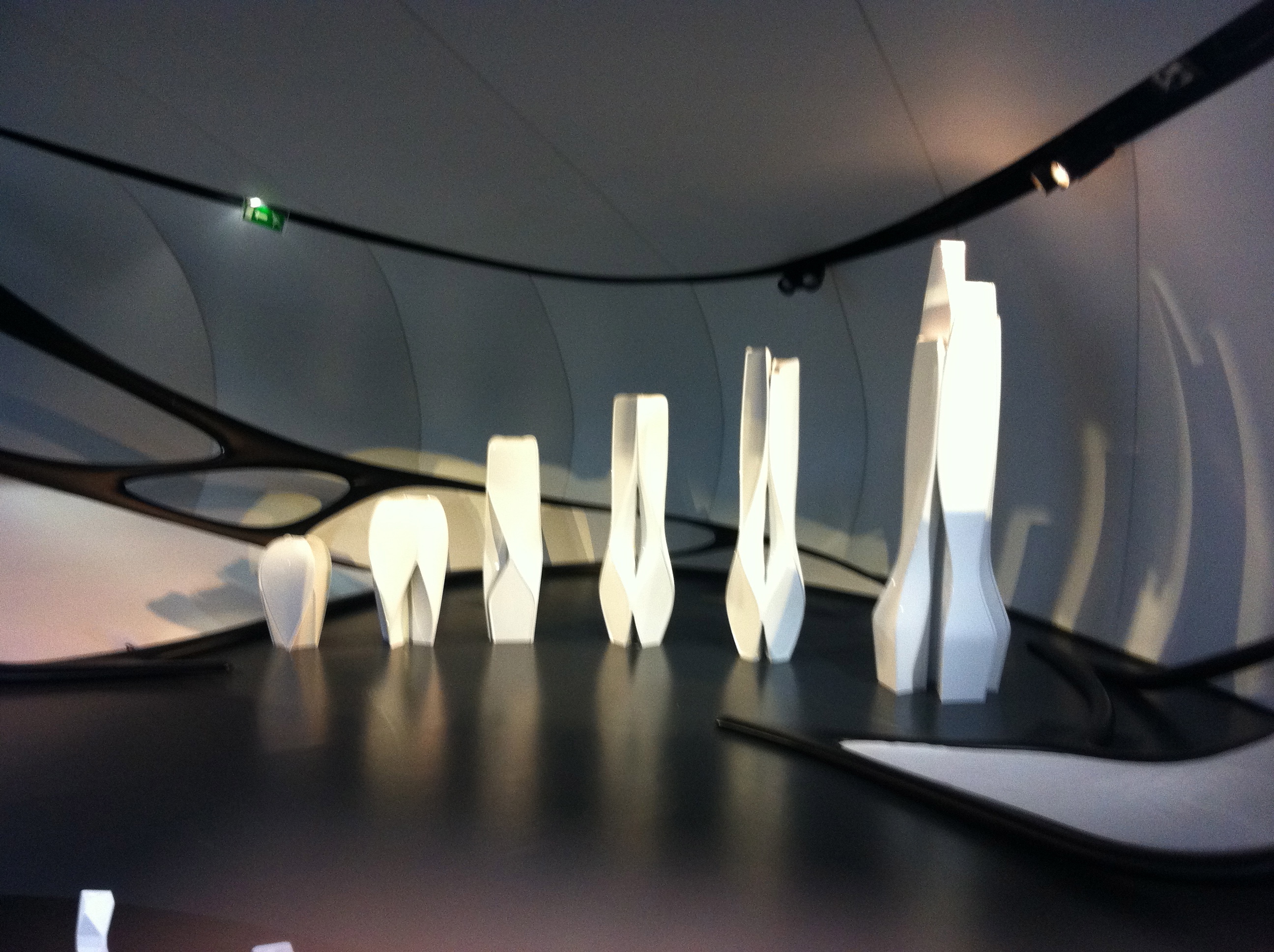 While out walking in the languid Paris drizzle yesterday, we saw a massive white capsule in front of the Institut du Monda Arabe and, upon closer inspection, saw that it was a mobile exhibition space recently donated by Chanel ( a nod to all their big spending babes from the Arab States no doubt). Inside was it’s first exhibition – Zaha Hadid Une Architecture.